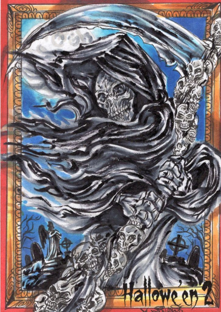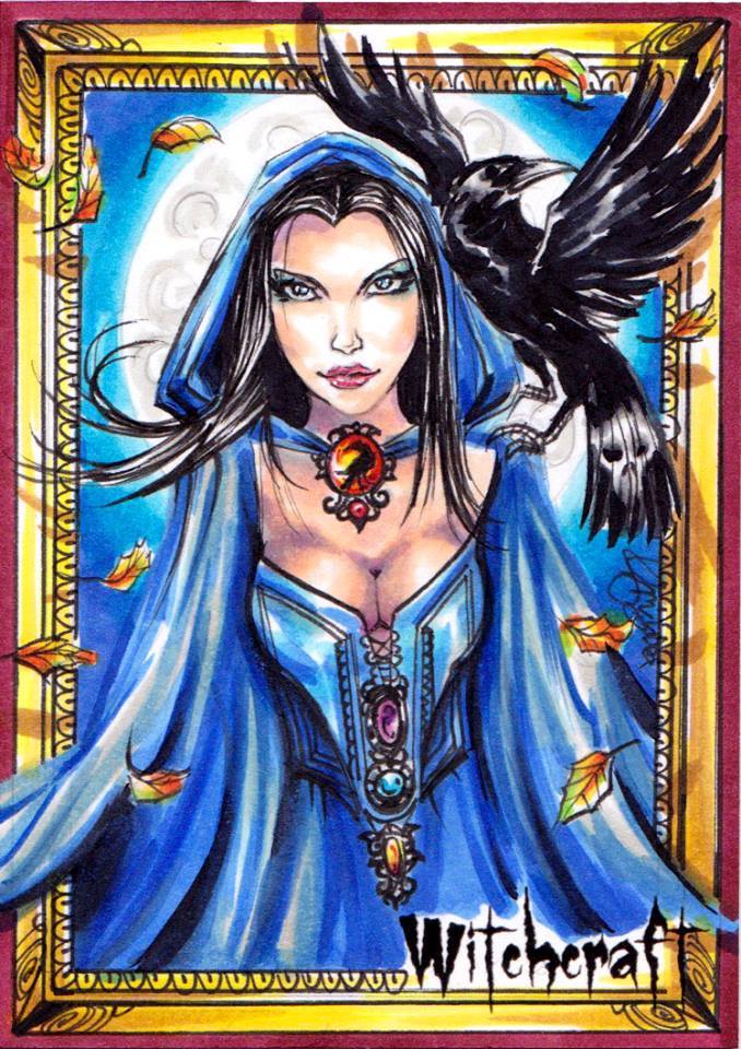 My first Artist Proof from Achilleas featured a grim reaper positioned straight at the viewer, “spilling out” over the card’s frame and holding a scythe decorated with tiny skulls all over. A later one had a witch similarly coming out of frame, stunningly decorated with intricate jewels, flanked by a wonderfully done pet raven, and surrounded by gently falling Autumn leaves.