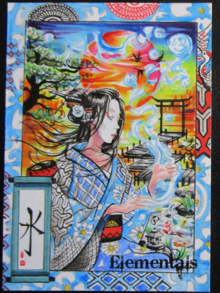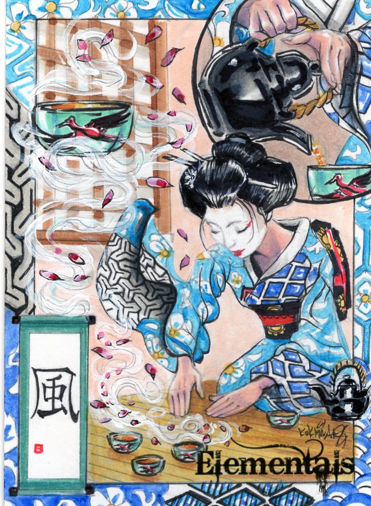 I was lucky enough to get one of his gorgeous wind elemental geisha sketch cards, and adored it so much I got two APs in a similar vein but with variations based on ideas I wanted incorporated from other cards he’d done. The results were all I could have asked for.