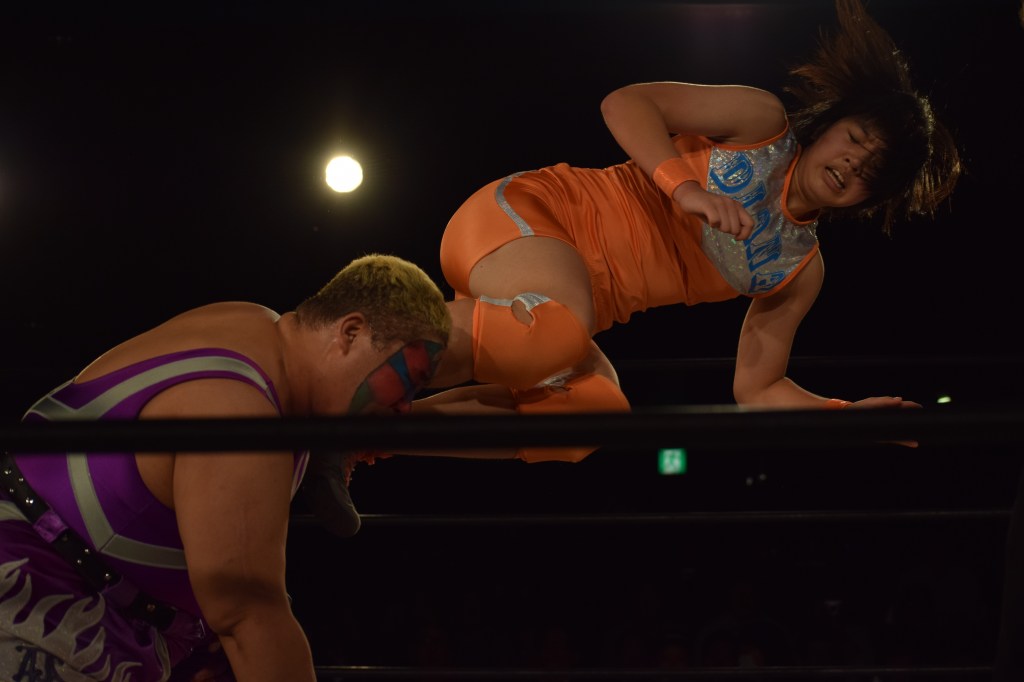 The last two sections saw Saya gaining her only pinfall over Ice Ribbon’s ace Tsukka with the “Gran Maestro de Tequila,” then falling to the rookie she’d given the moves to as Suzu Suzuki showed she also mastered Saya’s “Tequil Shot” variation.