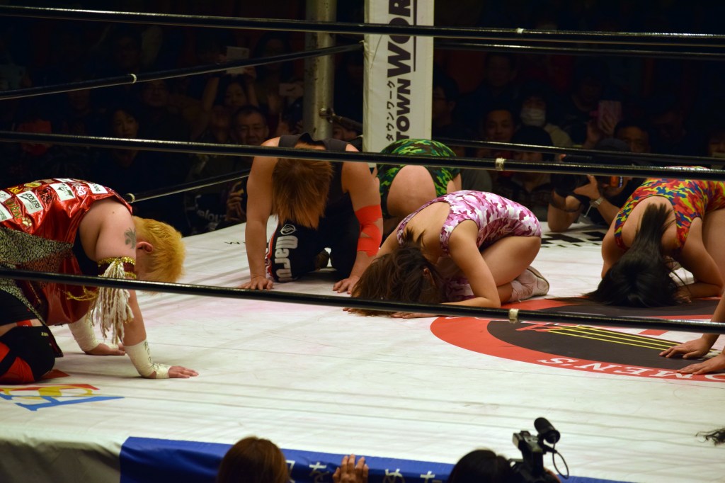 First was a exhibition match where Chigusa teamed with Maria, Mikoto Shindo, & Mei Hoshizuki vs Nyla Rose, Tomoko Wantanabe, KAORU, & Hibiki. After five minutes Chigusa and Nyla would switch sides, with the remaining five minutes being wrestled with the revised teams. It was all about the participants, and often their seconds, interacting with Chigusa. It was a lot of fun and clearly emotional for everyone involved.