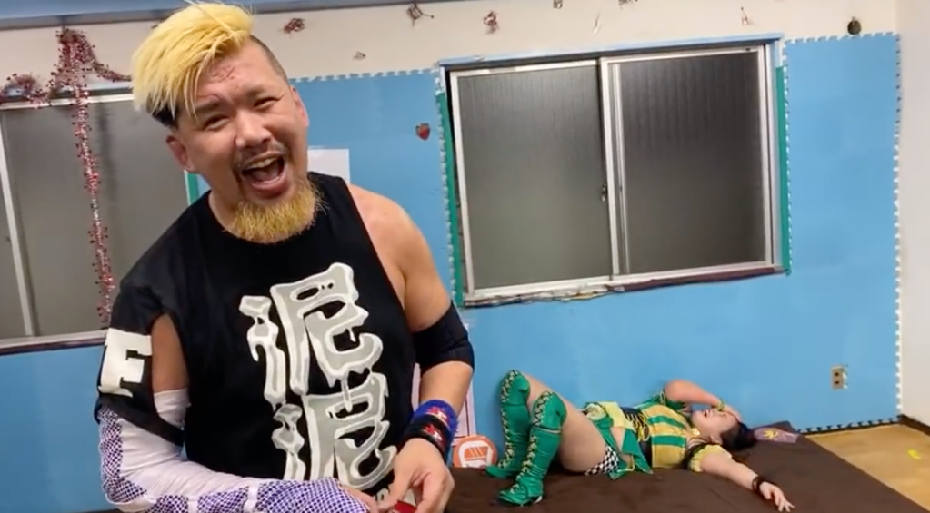 This was one of IR’s weird and wonderful stipulation matches. Each team was assigned 3 moves from the repertoire of Tequila Saya or Uno Matusya respectively, who amusingly demonstrated their moves on each other before the match. All 3 moves on your checklist must be successfully completed on your opponents.