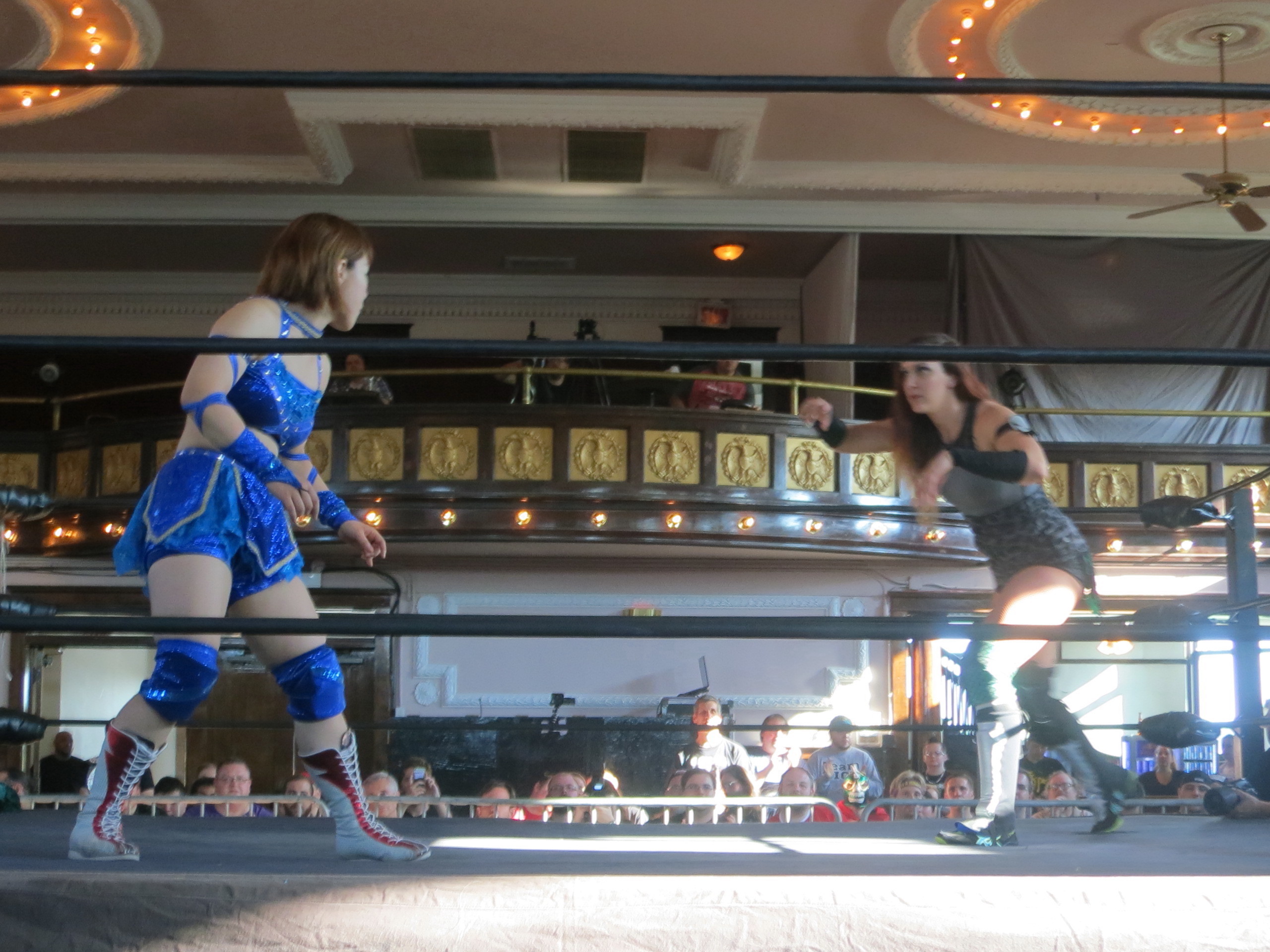 Mitsuru got fully into the superhero spirit, coming to the ring in a great mask styled like Sawasdee’s but incorporating her crane motif (more on the mask in my write up of Gatoh Move 5/4). They had a tall order in front of them in the form of a team of title holders: Gatoh Move’s Super Asia Champion Riho and their Thailand branch’s One and Only Champion Golem Thai.